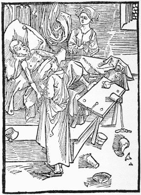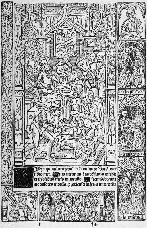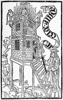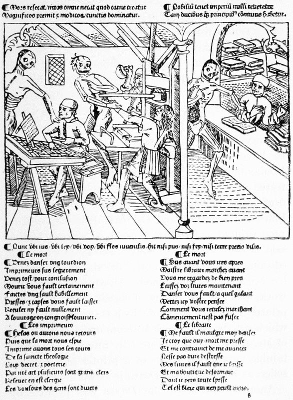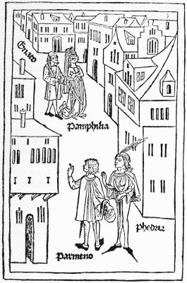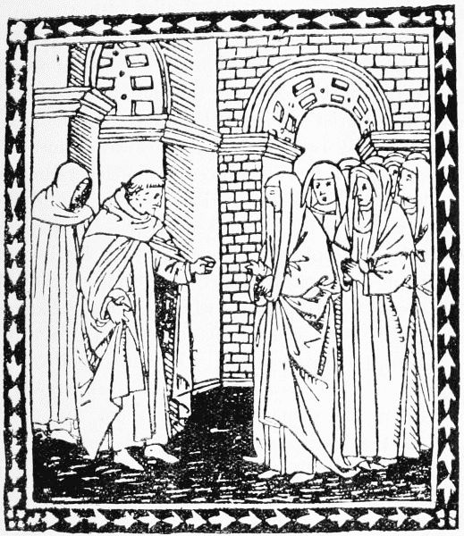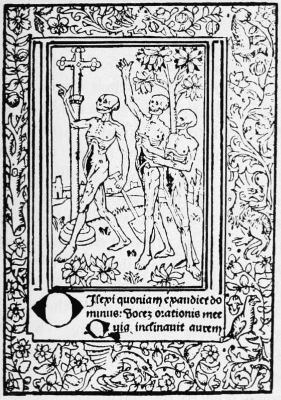 The last book of Pfister's we have to notice, the Complaint of the Widower against Death, is probably earlier than either of his dated ones. It contains 24 leaves, with five full-page cuts, showing (1) Death on his throne, and the widower and his little son in mourning; (2) Death and the widower, with a pope, a noble, and a monk vainly offering Death gold; (3) two figures of Death (one mounted) pursuing their victims; (4) Death on his throne, with two lower compartments representing monks at a cloister gate, and women walking with a child in a fair garden,—this to symbolise the widower's choice between remarriage and retiring to a monastery; (5) the widower appearing before Christ, who gives the verdict against him, since all mortals must yield their bodies to Death and their souls to God. The cuts in this book are larger and bolder than the other specimens of Pfister's work which we have noticed, but they are rude enough.