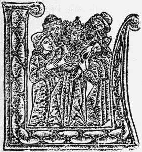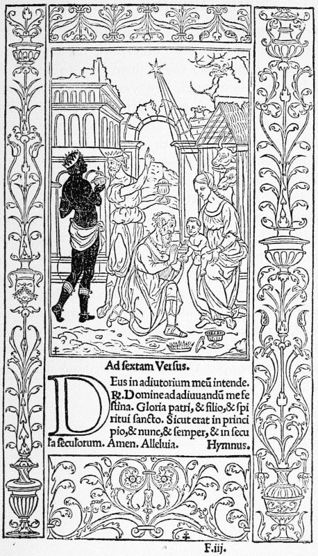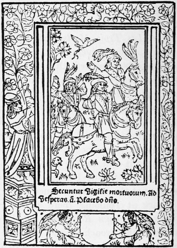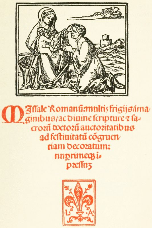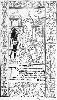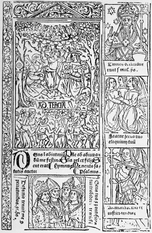 Perhaps the chief reason why the convenient custom of the title-page spread so slowly was that soon after 1470 the Augsburg printers began to imitate in woodcuts the elaborate borders with which the illuminators had been accustomed to decorate the first page of the text of a manuscript or early printed book. When they first appear these woodcut borders grow out of the initial letter with which the text begin, and extend only over part of the upper and inner margins. In other instances, however, they completely surround the first page of text, and this is nearly always the case with the very beautiful borders which are found, towards the close of the century, in many books printed in Italy. In these they are mostly preceded by a 'label' title-page. The use of borders to surround every page of text was practically confined[5] to books of devotion, notably the Books of Hours, whose wonderful career began in 1487 and lasted for upwards of half a century. Head-pieces are found in a few books, chiefly Greek, printed at Venice towards the close of the fifteenth century. In the absence of[Pg 35] any previous investigations on the subject, it is dangerous to attempt to say where tail-pieces first occur, but their birthplace was probably France.