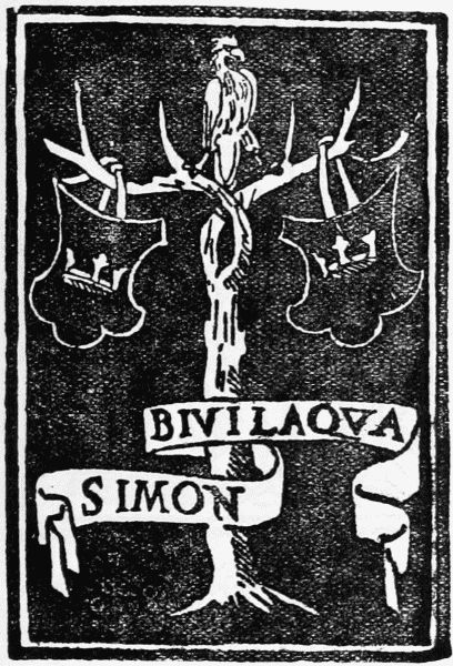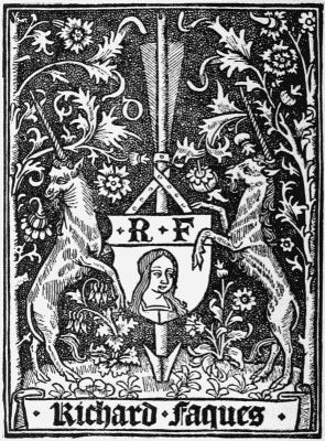 In England, also, a patron's coat was sometimes printed as one of the decorations of a book. Thus on the third leaf of the first edition of the Golden Legend there is a large woodcut of a horse galloping past a tree, the device of the Earl of Arundel, the patron to whom Caxton owed his yearly fee of a buck in summer and a doe in winter. So, too, in the Morton Missal, printed by Pynson in 1500, the Morton arms occupy a full page at the beginning of the book. Under Elizabeth and James I. the practice became[Pg 21] fairly common. In some cases where the leaf thus decorated has become detached, the arms have all the appearance of an early book-plate, and the Bagford example of Sir Nicholas Bacon's plate has endured suspicions on this account. In this instance, however, the fortunate existence of a slight flaw in the block, which occurs also in the undoubtedly genuine gift-plate of 1574, offers a strong argument in favour of its having been in the possession of Sir Nicholas himself, and therefore presumably used by him as a mark of possession.