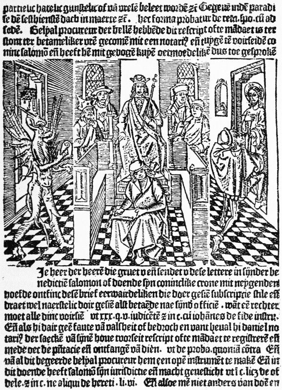 In the order of introduction, the next addition to a printer's stock-in-trade which we have to chronicle is the use of woodcut illustrations. These were first employed by Albrecht Pfister, who in 1461 was printing at Bamberg. Like Schoeffer's coloured initials, Pfister's illustrated books form an incident apart from the general history of the development of the printed book, and it will be convenient, therefore, to give them a brief notice here, rather than to place them at the head of our next chapter. They are six in number, or, if we count different editions separately, nine, of which only two have dates, viz.: one of the two editions of Boner's Edelstein, dated 1461, and the Buch der vier Historien von Joseph, Daniel, Esther, und Judith, dated 1462, with Pfister's name in the rhyming colophon already alluded to. The undated books are another edition of the Edelstein; the Belial seu consolatio peccatorum; a Biblia Pauperum; two closely similar editions of this in German; two editions of the Rechtstreit des Menschen mit dem Tode, also called Gespräch zwischen einem Wittwer und dem Tode. Attention was first drawn to these books by the Pastor Jacob August Steiner of Augsburg in 1792, and when the volume which he described was brought to the Bibliothèque Nationale, with other[Pg 27] spoils from Germany, a learned Frenchman, Camus, read a paper on them before the Institute in 1799. The three tracts which the volume contained were restored to the library at Wolfenbüttel in 1815, but the Bibliothèque has since acquired another set of three and a separate edition of the German Biblia Pauperum. The only other copies known are those in the Spencer Collection, one of the Belial at Nuremberg, and a unique example of the undated Edelstein at Berlin.[3]