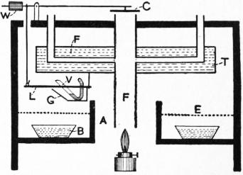 Hearson has designed several forms of bacteriological (biological) incubators, made by Chas. Hearson & Co., Ltd. Some are heated by a petroleum lamp and others by a gas flame. In the form heated by a lamp, for which, however, gas can be substituted, the incubation chamber is surrounded by a water tank (fig. 9, A) and the lowest part of this is traversed by an in-going (L) and an out-going flue. The mode of regulation of the temperature is by means of a thermostat which operates the movements of a cap (F) over the main flue (V), and it is identical in its chief features with the method employed in the chicken incubator. The thermostat (S) is situated in the upper part of the incubation chamber.