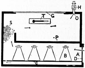 At the Pasteur Institute in Paris, and at other large laboratories in France, the bacteriological incubator is raised to the dimensions of a room. In the centre of this room is a large boiler heated by gas-burners, the fumes from which pass through a large flue to the outside. The flame of the burners is regulated by a bimetallic thermostat. The gas by-pass can be regulated by an attendant. The cultures are contained in vessels placed on shelves, which are ranged round the side of the room.