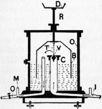 Moitessier’s regulator (fig. 21) is more complex, and needs more skilled work in its construction. It consists of an outer and closed cylinder (O), which is filled about half-way up with a mixture of acid-free glycerine and distilled water in the proportion of two to one respectively. Within the cylinder is a bell (B), the lower and open end of which dips under the glycerine-water mixture. From the top of the bell a vertical rod (R) passes up through an aperture in the cover of the outer cylinder, and supports the weighted dish (D). The inlet (I) and outlet (O) pipes enter the chamber of the bell above the level of the glycerine-water mixture. The outlet tube is a simple one; but the inlet tube is enlarged into a relatively capacious cylinder (C), and its upper end is fitted with a cover which is perforated by an aperture having a smooth surface and concave form. Into this aperture an accurately fitting ball- or socket-valve (V) fits. The ball-valve is supported by a suspension thread (T) from the roof of the bell (B). The apparatus should be adjusted in the morning when the pressure is low, and the dish (D) should be then so weighted that the full amount of gas passes through. The size of the flame should then be adjusted. Should the pressure increase, the bell (B) is raised and with it the ball-valve (V). The aperture in the cover of the inlet cylinder is consequently reduced and some of the gas cut off. When the pressure falls again, the ball-valve is lowered and more gas passes through. The relative pressure in the inlet and outlet pipes can be read off on the manometer (M) placed on each of these tubes.