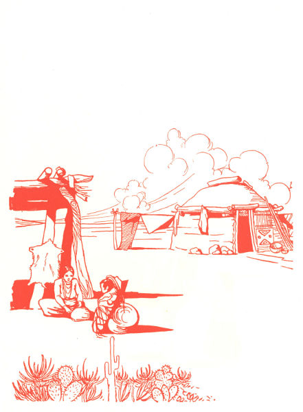 Every morning Bah had a lesson in weaving, just as you have a drawing lesson or a sewing lesson. Her father had made her a tiny loom which stood outside the hogan door next to her mother's big loom.