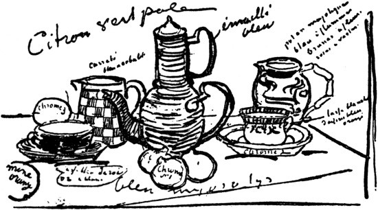 “Tout d’abord je trouvai en tout et pour tout un désordre qui me choquait. La boîte de couleurs suffisait à peine à contenir tous ces tubes pressés, jamais refermés, et malgré tout ce désordre, tout ce gâchis, un tout rutilait sur la toile.”[2]
