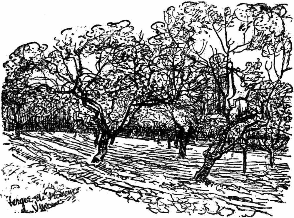These are the thoughts of his most prolific period—the period during which he produced perhaps all his most striking pictures—the last three years of his life. Such pages of beauty as the “Orchard in Provence,” belonging to Madame Cohen Gosschalk-Bonger, “A Street in Arles,” in the possession of the Municipal Museum at Stettin, “A Street in Auvers,” belonging to A. von Jawlensky, Munich, hail from this period, as also “The Lawn,” probably in the possession of the family—a finished masterpiece of beauty; “The Sunset” belonging to Frau Tilla Durieux-Cassirer—excellent; and a number of other landscapes belonging to Frau Kröller, Frau Mauthner, Frau Cohen Gosschalk-Bonger, etc.—all of great splendour and mastery.