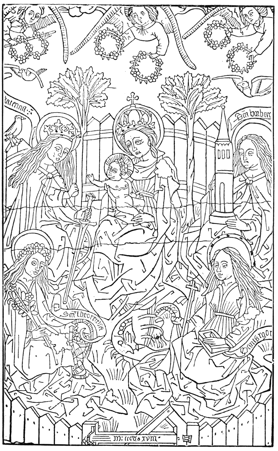 In the Royal Library at Brussels there is a coloured print of The Virgin with the Holy Child in her lap, surrounded by four Saints in an inclosed garden. On the Virgin's right hand sits St. Catherine, with a royal crown on her head, the sword in her left hand, and, leaning against her feet, a broken wheel. Beneath is St. Dorothea crowned with roses, with a branch of a rose-tree in her right hand and the handle of a basket of apples in her left; on the other side are St. Barbara holding her tower, and, under her, St. Margaret with a book in her left hand; her right hand clasps a laidly dragon, and a cross leans upon her arm. {3}