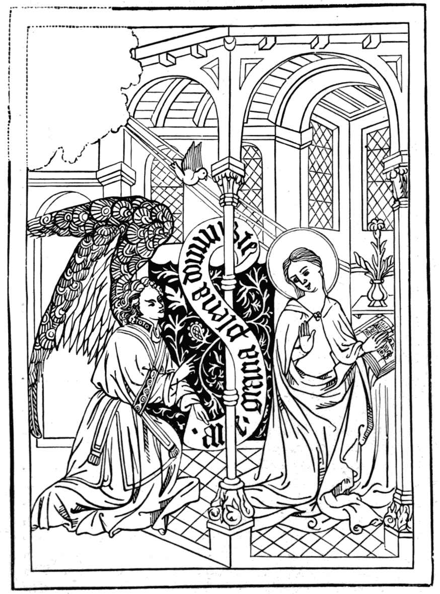 In the Spencer collection are two other prints which may be attributed to the same period as the St. Christopher. One is a picture of The Annunciation, which was found pasted on the end cover of the book (Laus Virginis) in which the St. Christopher was discovered. It is of similar size, and is printed with a dark-coloured pigment, probably by means of a frotton. The Angel Gabriel is kneeling before the Virgin, who also is kneeling; she holds a book in her hand, and is represented in a kind of Gothic chapel; a vase with flowers in it stands under one of the diamond-paned windows. The Holy Dove is descending in a flood of rays; unfortunately the figure of the Almighty has been torn from the top left-hand corner of the print. On one of the pillars of the chapel is a small scroll with the legend