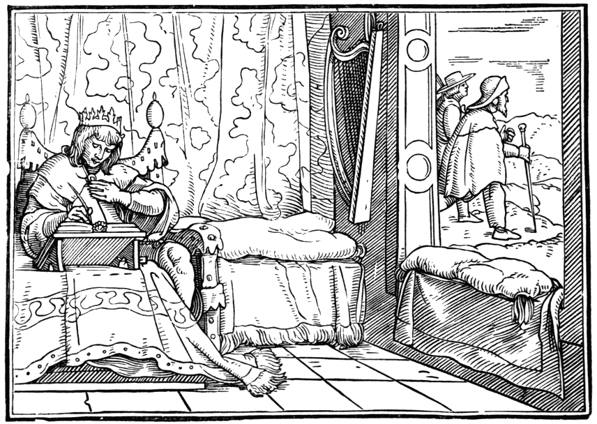 Mr. Linton is enthusiastic in praise of this cut. 'I am well content,' he says, 'to give some words of unstinted praise to our St. Christopher for the design. I mind not the disproportionate space he occupies in the picture. Is not he famous as a giant? The perspective also is good enough for me, as doubtless it was to those in whose interest the print was issued. It is certain he is crossing a stream; we see a fish beneath the waves. He supports his colossal frame and helps his steady course with a full-grown fruit-bearing palm-tree—fit staff for saintly son of Anak; no heathen he; the nimbus is round his head. As on his shoulders he bears the Lord of the World, can we fail to remark his upturned glance, inquiring why he is thus bowed down by a little child? The blessing hand of the Blessed plainly gives reply. Look again, and see on one side of the stream the merely secular life; is it not all expressed by the mill and the miller and his ass, and far up the steep road (what need for diminishing distance?) the peasant with the sack of flour toiling towards his humble home. And on the other side is the spiritual life—the hermit, by his windowless hut, the warning bell above; he kneels in front, with his lantern of faith lifted high in his hand, a beacon for whatever wayfarer the ferryman may bring. Rank grasses and the fearless rabbit mark the quiet solitude in which the hermit dwells. I can forgive all shortcomings. These old-century men were in earnest.'