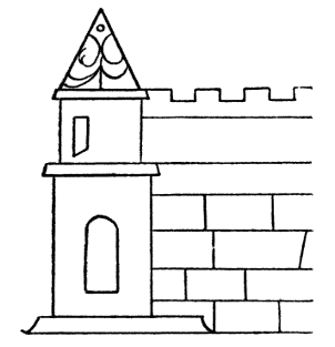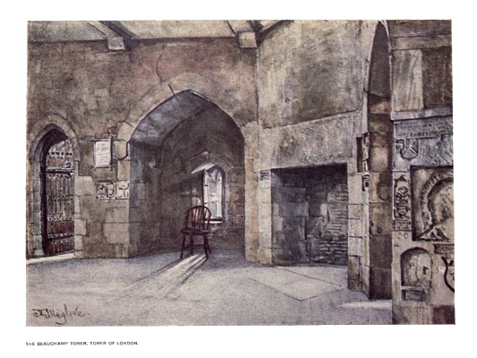 | This building affords an interesting example of the ground floor of a tower of the thirteenth century with massive walls and deep embrasures. It became famous as a prison in Tudor times and later when numerous notable persons were incarcerated; the carvings on the walls reveal many notable names. | ||