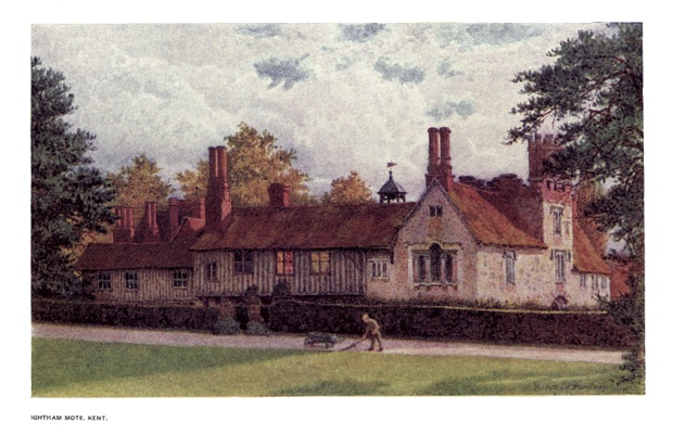 | Ightham Mote boasts of a Hall erected early in the fourteenth century and one of the best of its kind. The tower is of Perpendicular architecture, and most of the other portions Elizabethan. The half-timber work exhibited in this building is a beautiful example, and the whole structure harmonizes in the happiest manner with the uncommon beauty of the surroundings. | ||