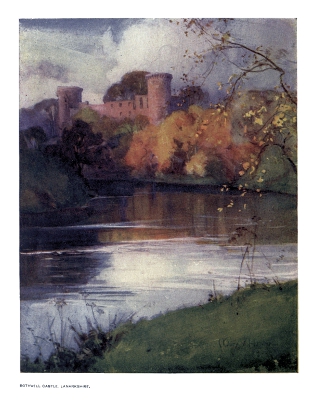 | Bothwell Castle stands in all the majesty of ruin upon the banks of the Clyde, and is without doubt the grandest example in Scotland of the simple enclosure castle of the thirteenth century. A deep and wide moat protects it upon the land side, and its Donjon is also strengthened by its own ditch. | ||