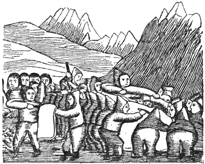 Eskimos cutting up a whale. Woodcut from Greenland,