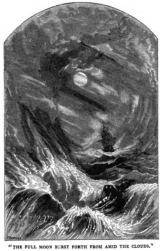 Night came on, and shortly afterwards the snow began to fall thickly, covering our deck, while from one side of the heavens the full moon burst forth from amid the clouds, lighting up the scene, increasing rather than diminishing its horrors. The snow circled in thick eddies round us, the sea foamed and raged, and masses of ice in the wildest motion were swept by; the timbers strained and creaked, while the ship shook under the reiterated shocks, sufficient it seemed to rend her into fragments, but the ice which had collected round her prevented her destruction.