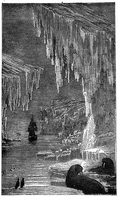 When I awoke a change had come over the scene. I went on deck, a perfect calm prevailed. All round us were piles of ice. The blocks and masses which stood out against the sky were cast into shades, while the level floes sparkled like silver in the rising sun. Far away to the southward we could still see the ocean heaving slowly. In a short time, however, leads between the bergs and floes opened out, the water being of the colour of lead. All hands were called up to make sail, and we stood on forcing our way between the floes, until open water was reached, though in every direction lofty icebergs and extensive floes were still to be seen. Many of the bergs were of the most fantastic form and brilliant colours. Some had arches of vast size, others caverns worn in them within which the ice appeared of the brightest blue and green, curtained with glittering icicles, all without being of stainless white.