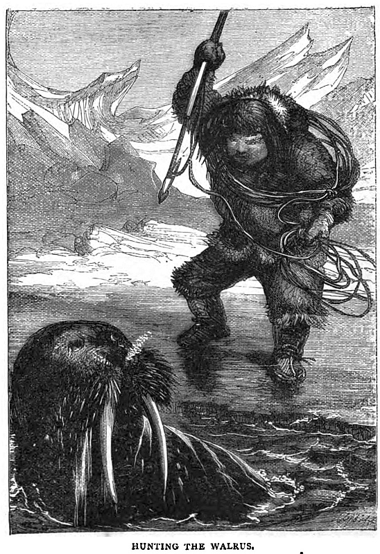 My brother fired and missed. The animal disappeared. We felt far from easy, for we knew that there was a great chance of its rising directly under the boat which it might too possibly capsize, or it might tear out a plank with its formidable tusks, when it would follow up the proceeding by attacking us as we struggled in the water. Happily, however, exhausted by the wounds it had received, it rose a short distance ahead, when a thrust from Andrew’s spear finished its career. We hauled it up on the ice by means of the tackles we carried for the purpose, to denude the huge body of the skin and blubber.