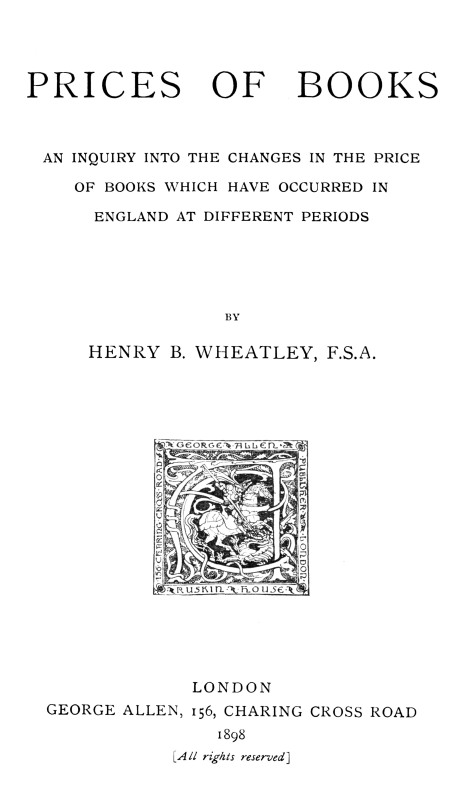 The history of prices is one of the most interesting subjects that can engage research. As language has been called fossil poetry, from which the primitive workings of the mind of man may be elicited, so the story of his progress in material well-being lies enfolded in the history of the prices which have at various periods been procurable for commodities, whether of prime necessity, of general utility, or simply ornamental. The prices of books, so ably investigated and recorded by Mr. Wheatley in the following pages, are a small but significant department of a great subject. If we had no record of the price of any other article of commerce, we should still perceive in them an index to the world’s advance in wealth, taste, and general intelligence. With every allowance for the fall in the value of money, it would yet be manifest that prices could now be afforded for books which at an earlier period would have been out of the question; and not less so that while some classes of books had risen in worth with the enhanced standard of wealth, others had accommodated themselves to the requirements of the poor. We should trace the effect of mechanical improvements in diminishing the[vi] prices of things, and of fashion and curiosity in augmenting them. We should see the enormous influence of scarcity in forcing up the value of products, while we should learn at the same time that this was not the sole agent, but that intrinsic merit must usually to some extent co-operate with it, and that prices must bear some relation to the inherent reason of things. It must, for instance, have been entirely unforeseen by the early printers that the books which they advertised with such exultation as cheaper than the manuscripts they were superseding would in process of time become dearer, but we can discern this metamorphosis of relative value to have been rational and inevitable. Finally, the fluctuations of price would afford a clue to the intellectual condition of the age. Observing, for example, the great decline which, as a rule, has taken place in the value of early editions of the classics, we should conclude that either the classical writers were less generally esteemed than formerly, or that such progress had been made in their study that the old editions had become inadequate; and both conclusions would be well founded.