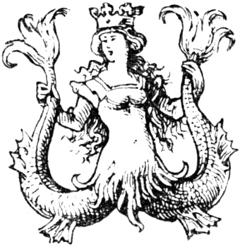 [31] The sign was also used by printers: John Rastall, brother-in-law to Sir Thomas More, “emprynted in the Cheapesyde at the Sygne of the Mermayde; next to Powlsgate in 1572.” Henry Binnemann, the Queen’s printer, dedicated a work to Sir Thomas Gresham, in 1576, at the sign of the Mermaid, Knightrider Street. A representation of the creature was generally prefixed to his books.—“History of Sign-boards,” p. 227.