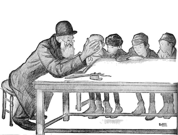 The old Jew on arriving in New York usually becomes a sweat-shop tailor or push-cart peddler. There are few more pathetic sights than an old man with a long beard, a little black cap on his head and a venerable face—a man who had been perhaps a Hebraic or Talmudic scholar in the old country, carrying or pressing piles of coats in the melancholy sweat-shop; or standing for sixteen hours a day by his push-cart in one 12 of the dozen crowded streets of the Ghetto, where the great markets are, selling among many other things apples, garden stuff, fish and second-hand shirts.