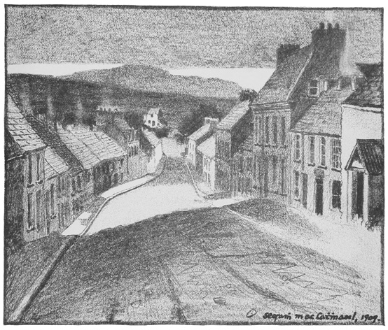 A waste of blown sand. The Atlantic breakers white upon its extremest verge. A patch of sea-bog before, exhaling its own peculiar fragrance—part fibre, part earth, part salt. Ricks of black turf stacked over it here and there, ready to be creeled inland against the winter firing. The dark green bulk of Slieve a-Tooey rising like a wall behind, a wisp of cloud lying lightly upon its carn. The village of Maghery, a mere clachan of unmortared stone and rain-beaten straw, huddling at its foot. A shepherd’s whistle, a cry in torrential Gaelic, or the bleat of a sheep coming from it now and again, only to accentuate the elemental quiet and wonder of the place. The defile of Maum opening beyond, scarped and precipitous, barely wide enough to hold the road and bog-stream that tumble through it to the sea. The rainbow air of our western seaboard enfolding all, heavy with rain and the fragrance of salt and peat fires.