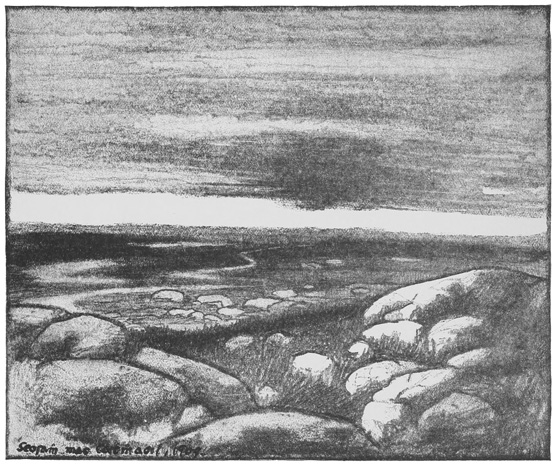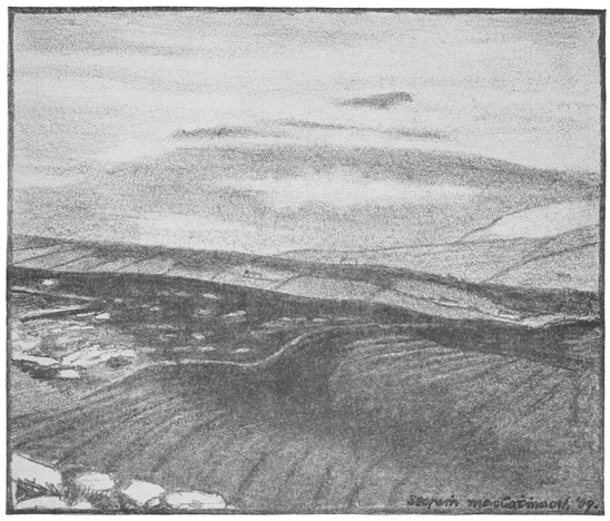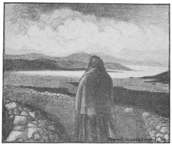 Through blown rain and darkness I see the Atlantic tumble in white, ghost-like masses on the strand. Beevna is a shadow, the crosses shadows. Only one friendly light burns in the valley. The patter of rain and the dull boom of the surf ring ceaselessly in my ears. The hills brood: my thoughts brood with them. I stare into the sunset—a far-drawn, scarlet trail—with mute, wondering eyes. Remoteness grips me, and is become a reality in this ultimate mearing of a grey, ultimate land.
