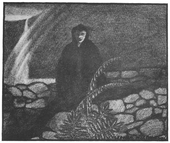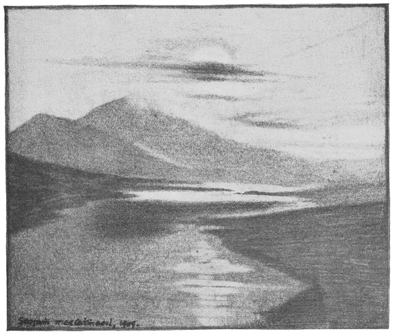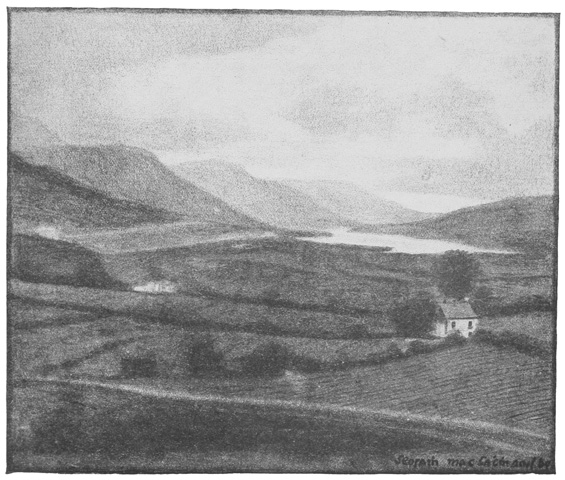 With regard to the pictures illustrating the book, several people who have seen them in the original have criticised their darkness, as if they were all drawn “in twilight and eclipse.” But the darkness of Donegal was the first thing that struck me when I crossed the frontier at Lifford, and the forty miles’ journey through the hills to Ardara bit the impression still more deeply into me. And if I were asked now after a year’s exile what I remember most vividly of the county, I should say its gloom. I can see nothing now but a wilderness of black hills, with black shadows chasing one another over them, a gleam of water here and there, and just the tiniest little patch of sunlight—extraordinarily brilliant by contrast with the general darkness—on half a field, say, with its mearing-stones, to relieve the sense of tragedy that one feels on looking at the landscape.