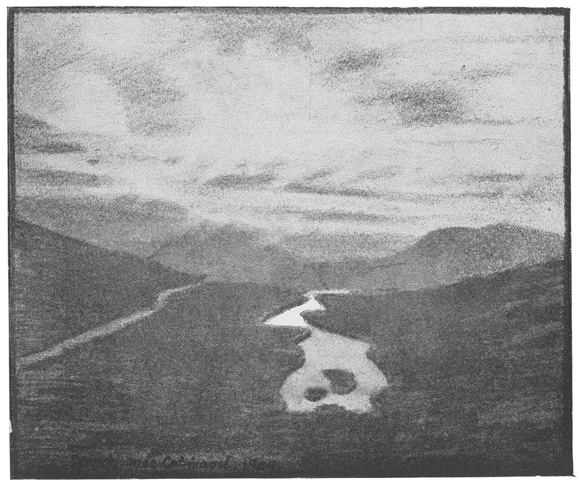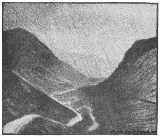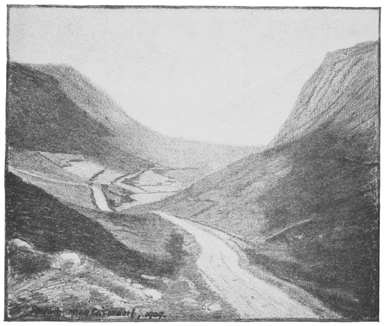 Darkness and austerity—those are the notes I carry away from this wild glen. Its lines have something of the splendid bareness of early architecture; its colour suggests time-stained walls, with quiet aisles and mouldering altars where one might kneel and dream away an existence. When you meet a stranger going the road that winds through it, like a coil of incense suspended in mid-air, you expect him to look at you out of eyes full of wonder, and to speak to you in half-chanted and serious words, stopping not, turning neither to left nor to right, but faring on, a symbol of pilgrimage: