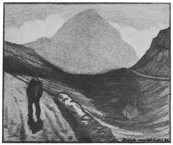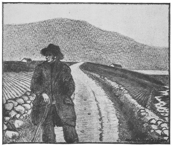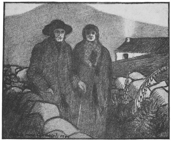 With regard to the pictures illustrating the book, several people who have seen them in the original have criticised their darkness, as if they were all drawn “in twilight and eclipse.” But the darkness of Donegal was the first thing that struck me when I crossed the frontier at Lifford, and the forty miles’ journey through the hills to Ardara bit the impression still more deeply into me. And if I were asked now after a year’s exile what I remember most vividly of the county, I should say its gloom. I can see nothing now but a wilderness of black hills, with black shadows chasing one another over them, a gleam of water here and there, and just the tiniest little patch of sunlight—extraordinarily brilliant by contrast with the general darkness—on half a field, say, with its mearing-stones, to relieve the sense of tragedy that one feels on looking at the landscape.