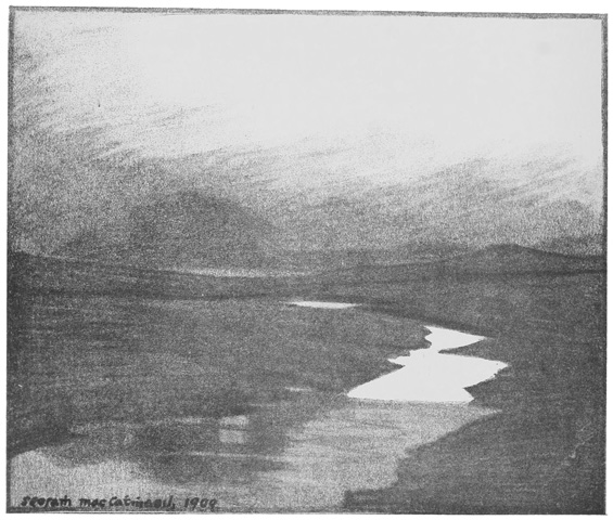 A day of wind and light, blown rain, with the sun shining through it in spells. Aighe river below me, brown and clear, foaming through mossed stones to the sea. Trout rising from it now and again to the gnats that skim its surface. Glengesh mountain in the middle distance—a black, splendid bulk—dropping to the Nick of the Bealach on the left. Meadows in foreground bright with marigolds, with here and there by the mearings tufts of king-fern, wild iris and fairy-thimble.