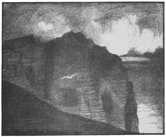 Through blown rain and darkness I see the Atlantic tumble in white, ghost-like masses on the strand. Beevna is a shadow, the crosses shadows. Only one friendly light burns in the valley. The patter of rain and the dull boom of the surf ring ceaselessly in my ears. The hills brood: my thoughts brood with them. I stare into the sunset—a far-drawn, scarlet trail—with mute, wondering eyes. Remoteness grips me, and is become a reality in this ultimate mearing of a grey, ultimate land.