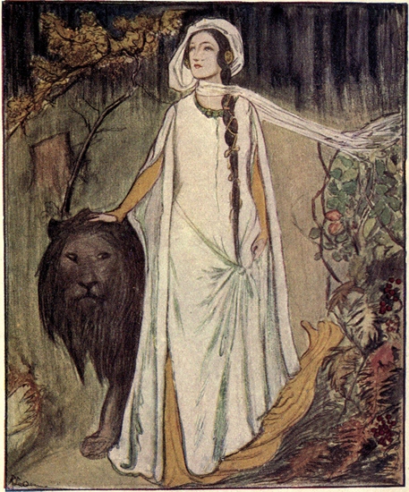Suddenly there rushed at her from out of the wood a furious lion. He was hunting for something to kill and eat, and when he saw Una he ran at her greedily, with hungry gaping jaws.