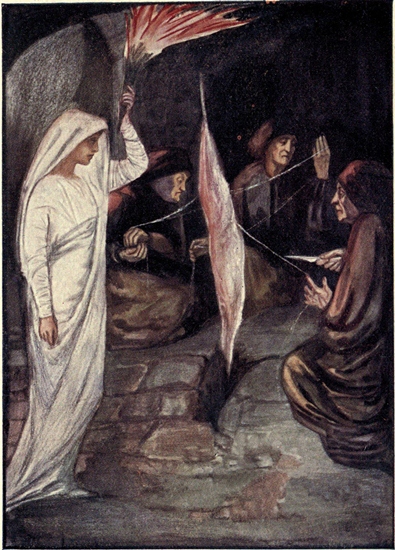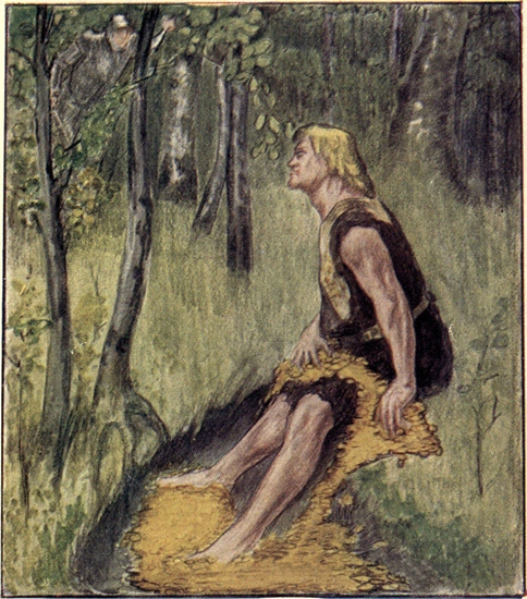 One day when she was very tired she lay down to rest under the trees in a thick wood. She took off her black cloak, and her beautiful golden hair fell loosely round her face. Her face was so fair and so full of goodness that it seemed to make sunshine in the shady place.