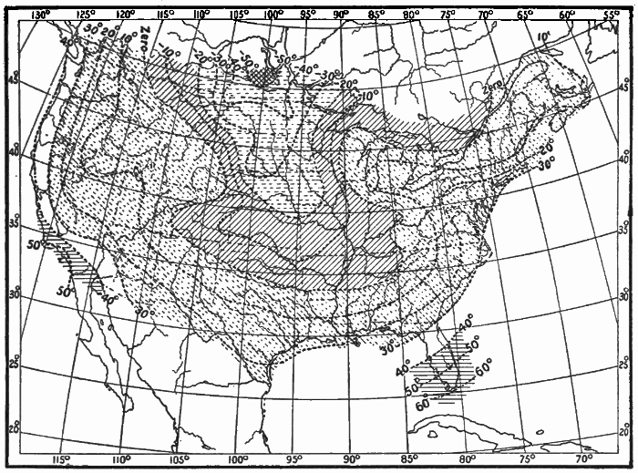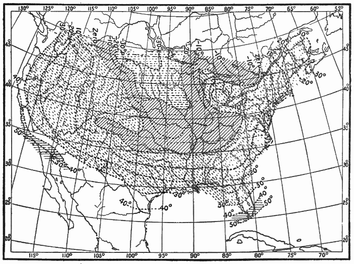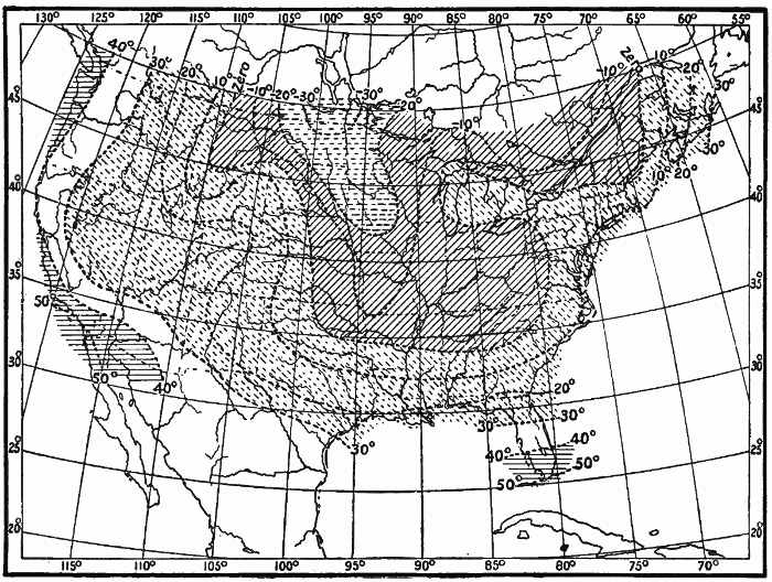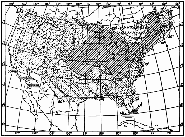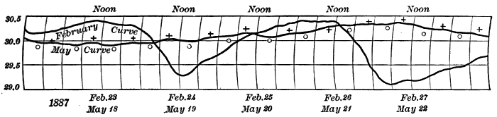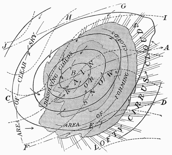 State of the Sky.—By the state of the sky is meant the condition of the sky as to its cloudiness. Clouds add much to the beauty and variety of nature. They are often gorgeously colored at sunset. By their changes in form, color, and amount from day to day they relieve what might otherwise be a wearisome succession of the same weather types. Prevailingly overcast skies have a depressing effect. Prevailingly clear skies become monotonous. A proper amount of bright sunshine is essential for the ripening of crops, but too much sunshine may parch soil and vegetation, and become injurious. Clouds bring rain; hence a sufficient amount of cloudiness is just as necessary as a sufficient amount of sunshine. The drift of clouds shows us the direction of movement of the air above us, and is of considerable help in forecasting the weather. Fog, which is a very low cloud, is in some cases so common as to be a meteorological element of great importance. In the city of London, where fogs are very prevalent, especially in winter, the average number of hours of bright sunshine in December and January is only fifteen in each month. The London fogs are, in great part, due to the presence in the air of vast numbers of particles of soot and smoke from millions of fires. These particles increase the density of the fog and prolong its duration.