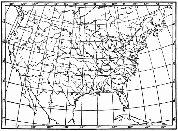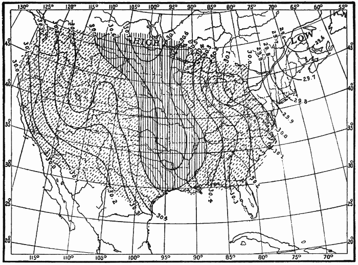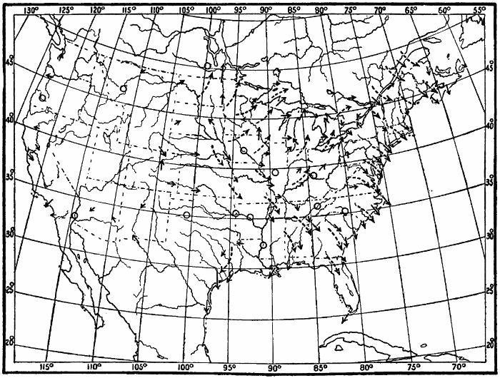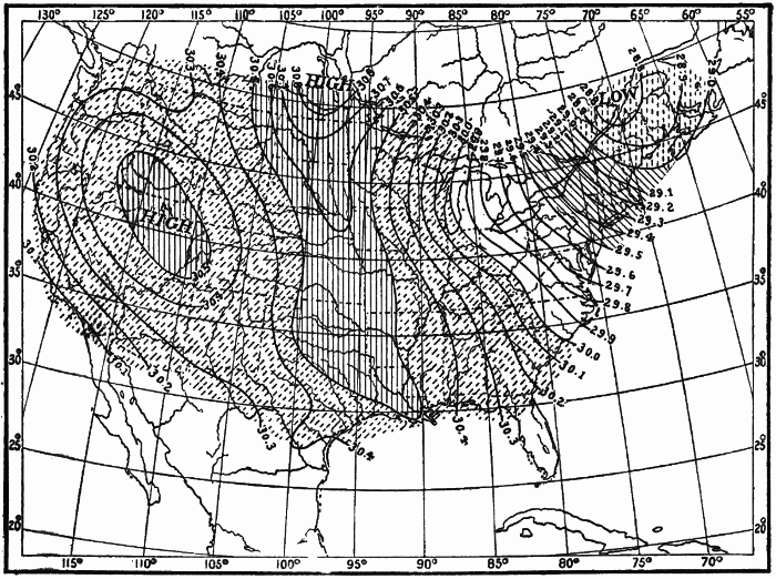 These observations are not made on land only. Hundreds of ship captains on all the oceans of the world are making their regular daily meteorological records, which at the end of the voyage are sent to some central office,[1] where they are studied and employed in the preparation of Pilot Charts for the use of mariners. By means of these ocean meteorological observations, which were first systematized and carried out on a large scale under the direction of Lieutenant Matthew Fontaine Maury (born, 1806; died, 1873), of the United States Navy, it has become possible to lay out the most favorable sailing routes for vessels engaged in commerce in all parts of the world.