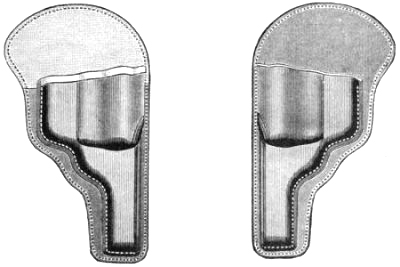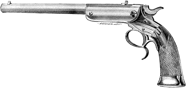 A number of years ago, when gentlemen sought to vindicate their honor by duels with pistols, it was the custom to provide themselves with a pair of duelling-pistols. These were generally of large calibre, often .50 or ½inch, generally of smooth bore and flint-lock. These and even larger calibres were also made for the cavalrymen in the service. Then came the percussion pistol, many styles of duelling-pistols, both smooth bore and rifled, and to-day many Southern gentlemen have in their possession a pair of these ancient arms handed down to them by their parents and grandparents. They are used chiefly, at the present time, for decorative purposes, for their days of usefulness are passed; the modern revolver has superseded them as arms of defence, and the single-shot breech-loading pistol, possessing much greater accuracy, far more convenient to load, and more economical to use, has taken the place of the duelling pistol for target work, stage shooting, and exhibition work. The single-shot pistol is used almost wholly for short-range target practice, generally in-doors, at a distance from five to fifty yards, or for small-game shooting. Therefore, it is unusual to find at the present time these pistols larger in bore than .32-calibre, and generally in[Pg 10] .22 calibre. As the .22-calibre is perfectly accurate up to fifty yards, and our own experiments compared with others lead us to believe the small calibre is fully as accurate as the larger, and beyond a doubt that with good weather conditions the larger bore possesses no advantages over the small bore up to fifty yards in point of accuracy, and the fact that the cost of the. 22-calibre ammunition is so much less, is more compact, allowing a large number of cartridges to be carried about, and the knowledge that the tiny bore can be shot so many times without cleaning, makes it the favorite calibre, in single-shot pistols, for target and small-game shooting within the distance named.