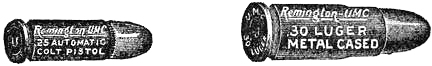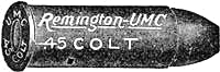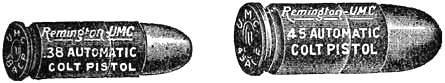 The ineffectiveness of the .38-caliber service revolver charge was frequently complained of by the officers and men serving in the Philippine Islands. This was due to the light powder charge and the conoidal shaped point of the bullet. To remedy this weakness .45-caliber revolvers were issued for the Philippine[Pg 21] service, and a new .45-caliber cartridge designed to which magazine pistol manufacturers were invited to adapt an arm. Unfortunately this new cartridge, which is now the service ammunition, has also a conoidal pointed bullet, is not well proportioned, and consequently develops only a part of its stopping power possibilities.