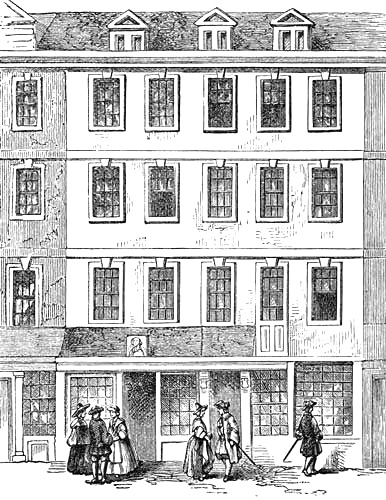 | Jacob Tonson’s Book-shop, 1742, from an etching by Benoist. The shop of this famous bibliopole was opposite Catherine Street. The view is obtained from the background of the print representing a burlesque procession of Masons, got up by some humourist in ridicule of the craft | 82 |