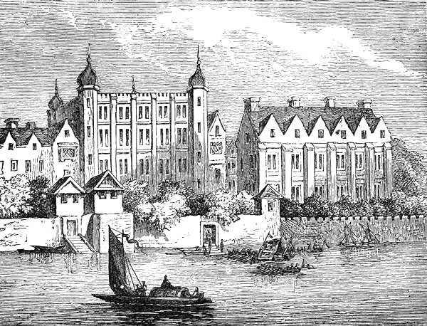 | York Stairs and surrounding Buildings, circa 1745, after an original drawing by Canaletti in the British Museum. This is one of the few interesting views of Old London sketched by Canaletti during his short stay in England. It comprises the famous water-gate designed by Inigo Jones, and the tall wooden tower of the York Buildings Water Company. The large mansion behind this (at the south-west corner of Buckingham Street) was that inhabited by Pepys from 1684, and in which he entertained the members of the Royal Society during his presidency. The house at the opposite corner (seen above the trees) is that in which the Czar Peter the Great resided for some time, when he visited England for instruction in shipbuilding | 144 |