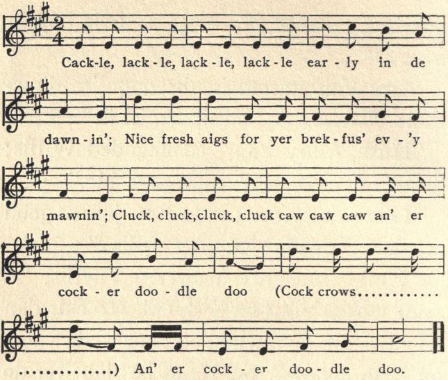 “Nem’ine whar de hants is terday. I’m talkin’ ’bout de rooster telerfome. Yer see Peter’s rooster’s settin’ up in rooster heb’n keepin’ his eye out fur all de news. He nuv’r do go ter sleep reg’lar; sometime at[Pg 29] night he sorter nod er lit’le, but he nuv’r do git in bed, caze he feer’d Mist’r Sun wake up ’fo’ he do. Well, whin he heah ole man Sun gap loud, an’ turn hisself ov’r an’ scratch, he know he fixin’ ter git up, an’ dat minit he flap his wings an’ telerfome loud es he kin ‘de break er day is c-o-m-i-n’’ (imitating the rooster). Ole man Diminicker down yonder on yo’ gran’pa’s rice plantation, down on de aige er de oshun, is de fus ter git de news. He stir hissef erbout an’ flop his wings, an’ telerfome loud es he kin, ‘de break er day is c-o-m-i-n’.’ De rooster on de nex’ plantation gits de wurd an’ dey passes hit on tell our ole rooster gits hit way up hyah in de mountains. Den our ole Shanghi keeps de wurd er gwine, tell ev’ry chickin fum one side de country ter de uth’r knows day fixin’ ter break.”