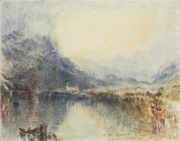 When I think of Turner it is the later water-colours that flash before me. The oils are magnificent, tremendous, wrought in rivalry and for fame: the water-colours, lyrical impressions, moods of elation inspired by beauty, are himself. We will go straight to the six studies that hung on the wall by the fireplace, essential effects selected with unerring instinct from the unessential, called "Running Wave in a Cross-tide: Evening;" "Twilight on the Sea;" "Sunshine on the Sea on a Stormy Evening;" "Breaking Wave on Beach;" "Sunset on the Sea;" and "Coasting Vessels." The very titles are lyrics. Yet they are not more beautiful than other interpretations, pushed into the region where feeling and vision merge into ecstasy—those I have already mentioned, and some, my particular favourites, hanging on the wall to the[Pg 63] left of Ruskin's bust—the "Pilatus," the careful alchemy of "Carnarvon," and the atmospheric veils that part above the "Lake of Uri." Year by year other of his water-colours shine out momentarily at exhibitions, such as at the last Old Masters, when we saw the blue and gold "Lake of Thun," and the visionary "Lake of Zug" about which Ruskin wrote so enthusiastically in "Modern Painters"; and the "apocalyptic splendour" of the "Zurich" at Messrs. Agnew's.