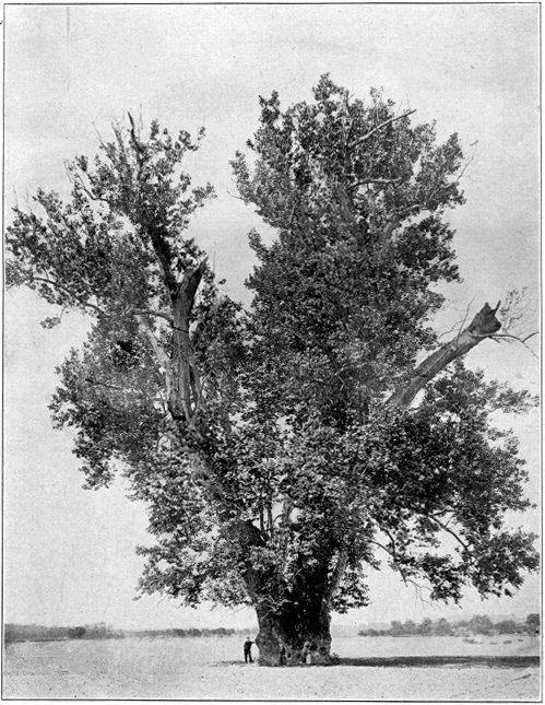 SYCAMORE NEAR WORTHINGTON. IND., THE LARGEST BROAD-LEAVED TREE IN THE U. S. FIVE FEET ABOVE THE GROUND IT IS 42 FT. 3 IN. IN CIRC.; THE EAST BRANCH IS 27 FT. 3 IN. IN CIRC. AND THE WEST BRANCH IS 23 FT. 2 IN. IN CIRC. SEE JOUR. HEREDITY, VOL. 6:407:1915.