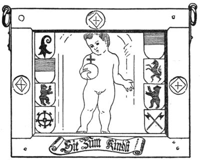 Signs wrought in iron seem to have been rare in England, the art of forging being less developed there than in the south of Germany.[Pg 241] Curiously enough the South-Kensington Museum in London, an enormous storehouse of old works of arts and crafts, contains not a single English sign, but a very beautifully forged iron sign from Germany, dated 1635,—a baker’s sign, as the great crown and the heraldic lions reveal to us. A friendly assistant at the Museum showed us another German sign dating from the end of the seventeenth century, charmingly carved and gilded, representing the workshop of a shoemaker. These two were the only signs that the Museum possessed.