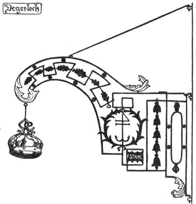 But the most ruthless enemy of the sign became the police itself, who once protected it. As early as the year 1419 we find an English police regulation, threatening with a fine of forty pence—in those days quite a sum—“that no one in future should have a stake bearing either his sign or leaves, extending or lying over the King’s highway, of greater length than seven feet at most.” As every innkeeper tried to outdo the other by the size and the magnificence of his sign,[Pg 270] one arrived finally at absurdly great constructions which really hampered the traffic: as in England, where we find wrought-iron signs which, like arches of triumph, reached from one side of the street to the other. A precious old book, “A Vademecum for Malt-Worms” (British Museum), in a quaint woodcut, “The Dog in Shoreditch,” gives us a picture of such a sign monument. To the artist’s eyes they were charming things, combining happily great lanterns with the sign into a harmony which we so often find lacking in modern days, where beautiful old signs through the addition of ugly modern lamps lose all their artistic charm of yore.