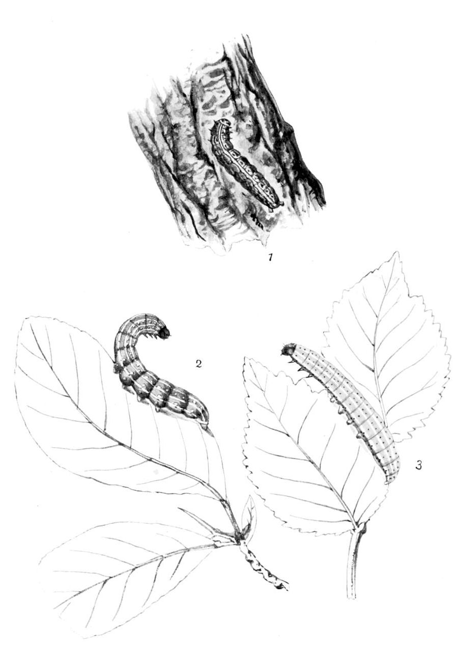 The caterpillar is brown inclining to yellowish, the head is reddish, and the plate on first ring blackish; there are three pale lines along the back, the central one more or less interrupted by dusky V-shaped marks, the others with an interrupted edging above; the stripe along the region of the blackish spiracles is yellowish grey. It lives on wych-elm and ash, eating the flowers, seeds, and leaves, but has a decided preference for the first two. It may be beaten in May and early June, sometimes in numbers, from the seeds (Plate 5, Fig. 3).