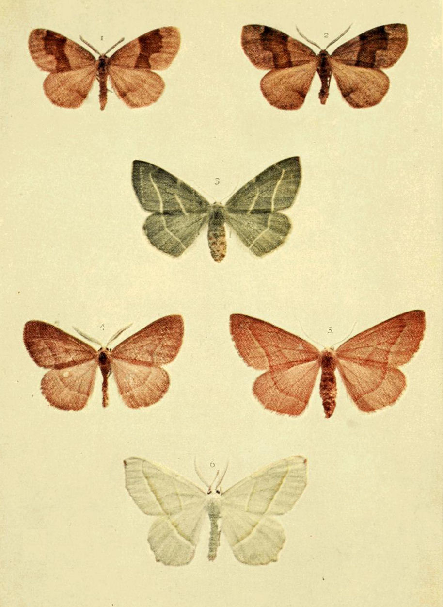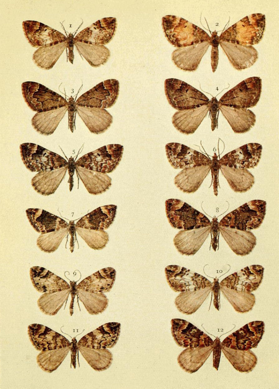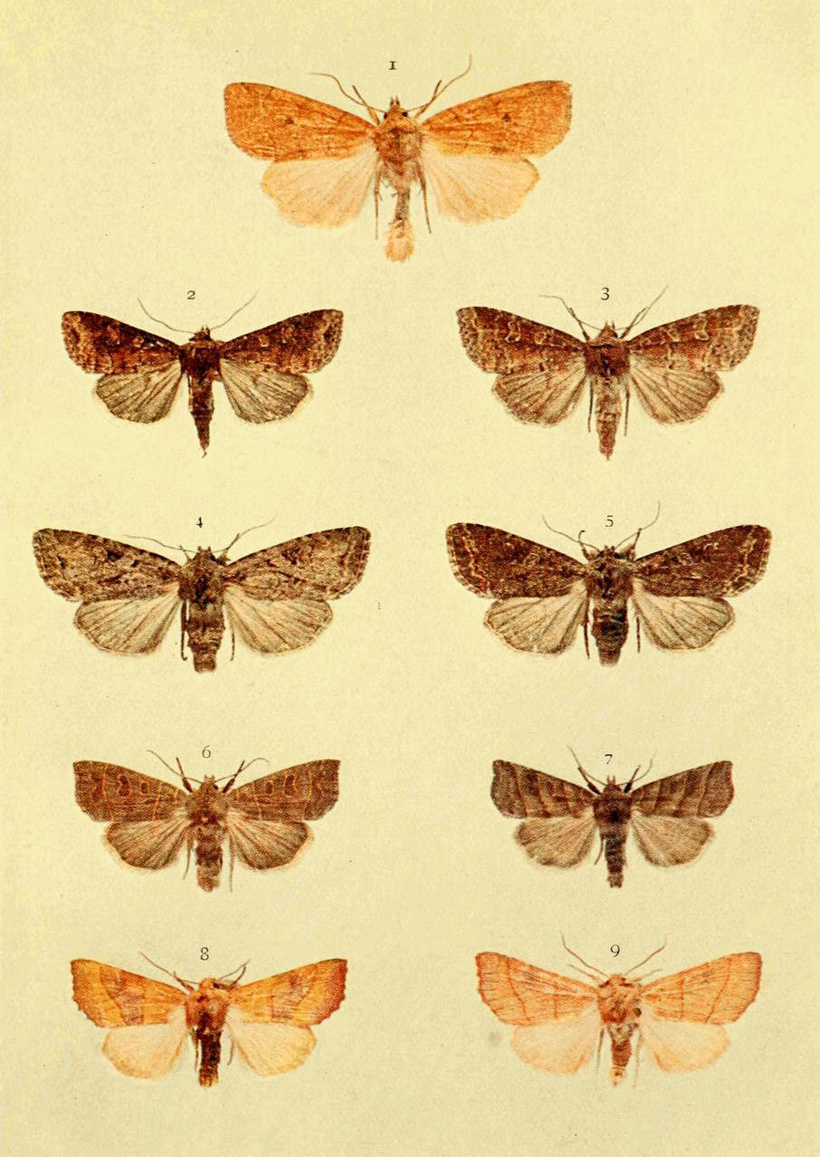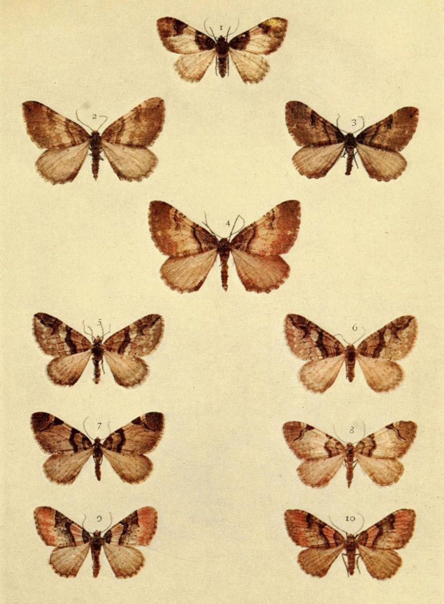On Plate 9 is shown a male specimen of the typical form (Fig. 1). In ab. ochrea, Tutt, the general colour of the fore wings is ochreous with a greenish tinge, and so it differs from the type, in which the ground colour is reddish. In another ochreous form the cross bands are of a purplish tint (ab. punica, Borkhausen), and in ab. rufina, Hübner, the bands are also purplish, but the ground colour is of a somewhat brighter red than in the type. Ab. unicolor, Tutt, is dull reddish with indistinct cross markings, and seems to be a modification of the almost unicolorous form of a bright red colour, ab. rufa, Tutt. (Fig. 2.)