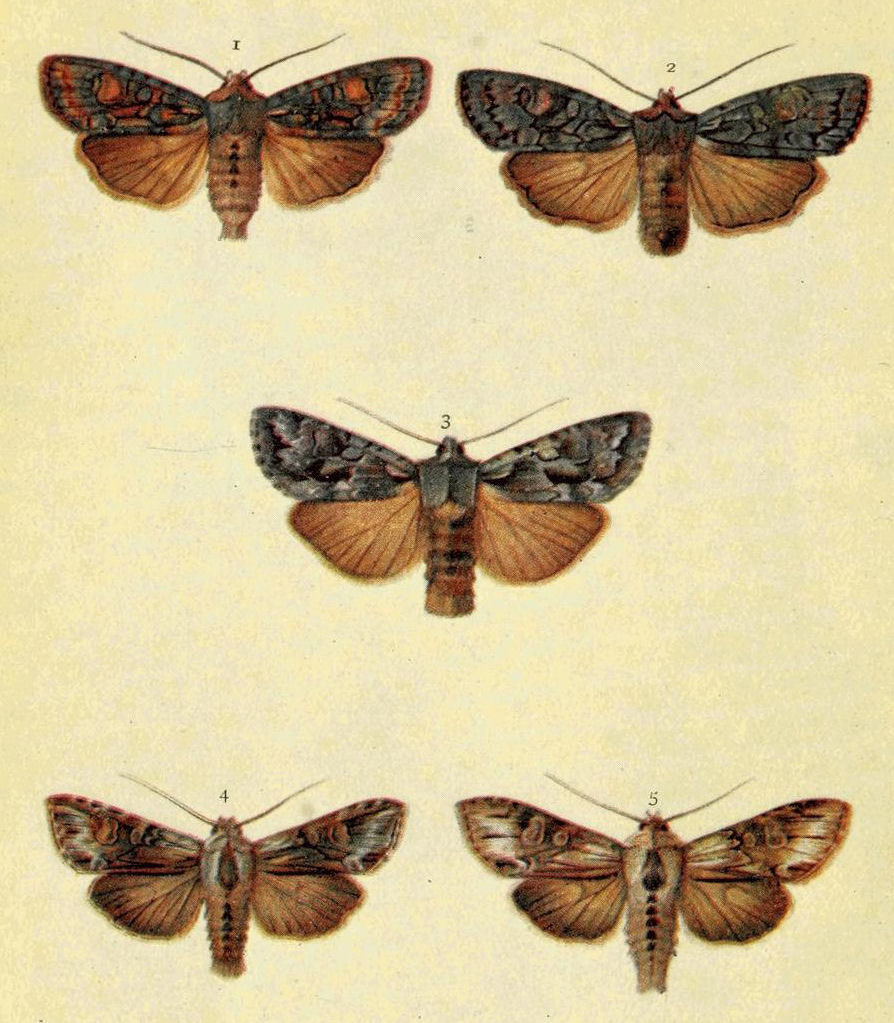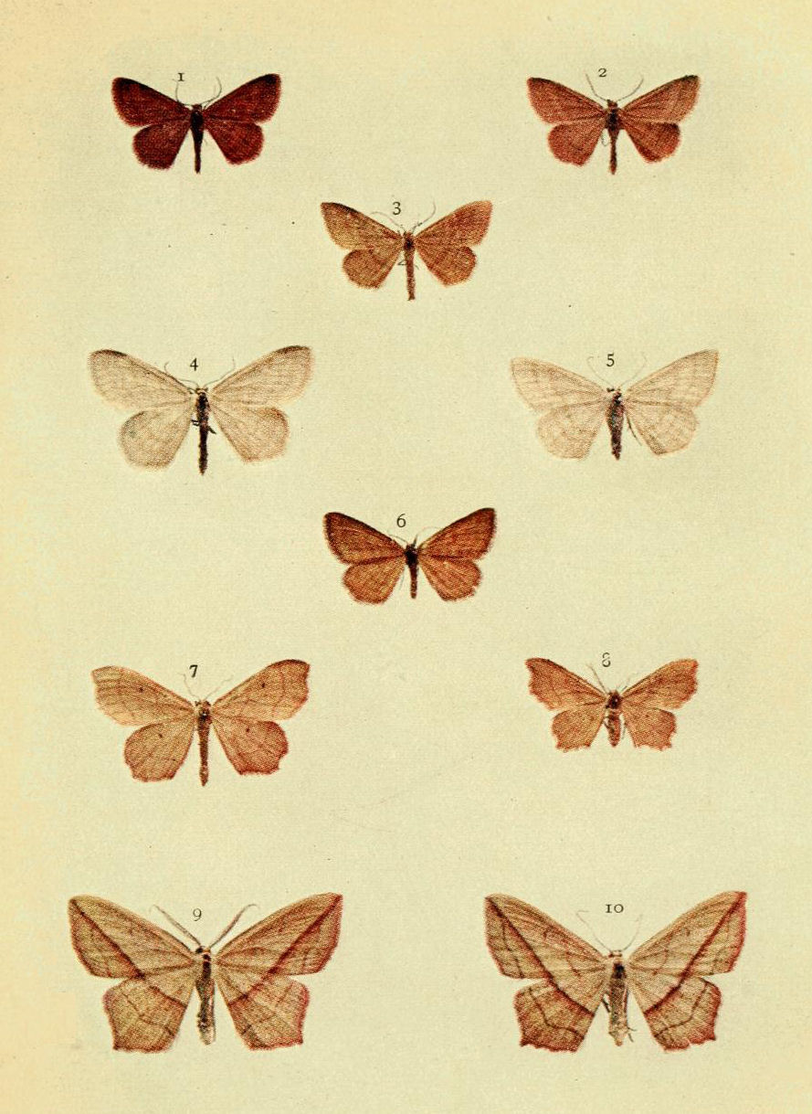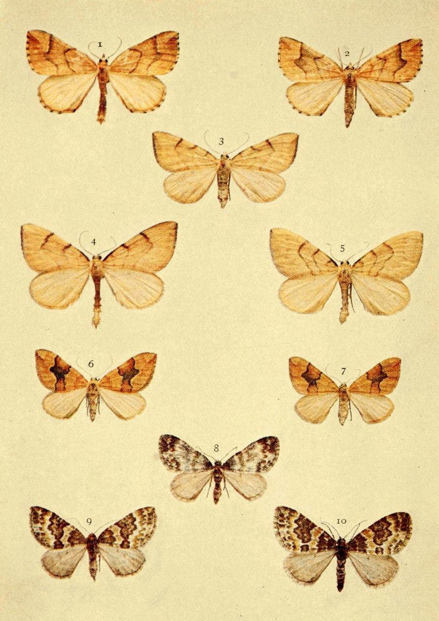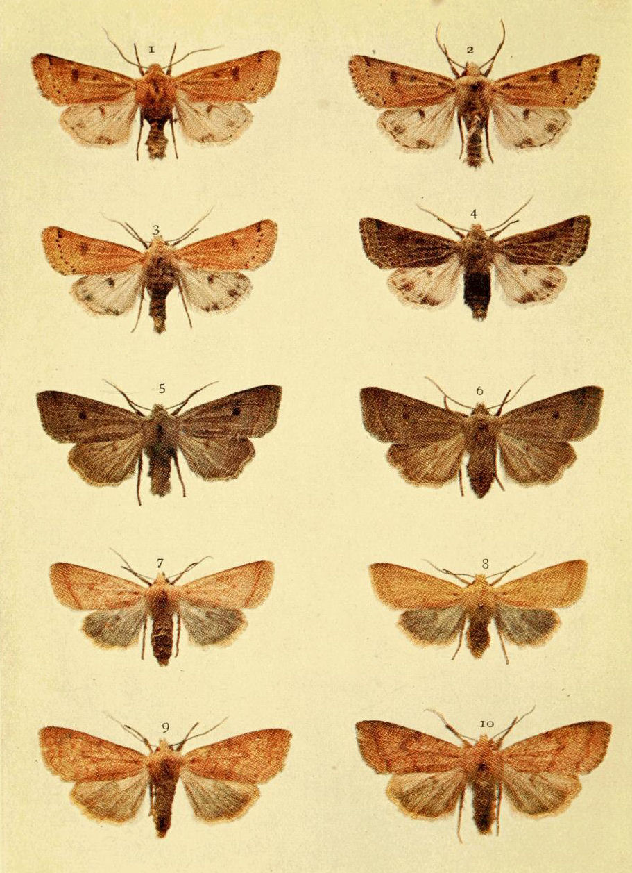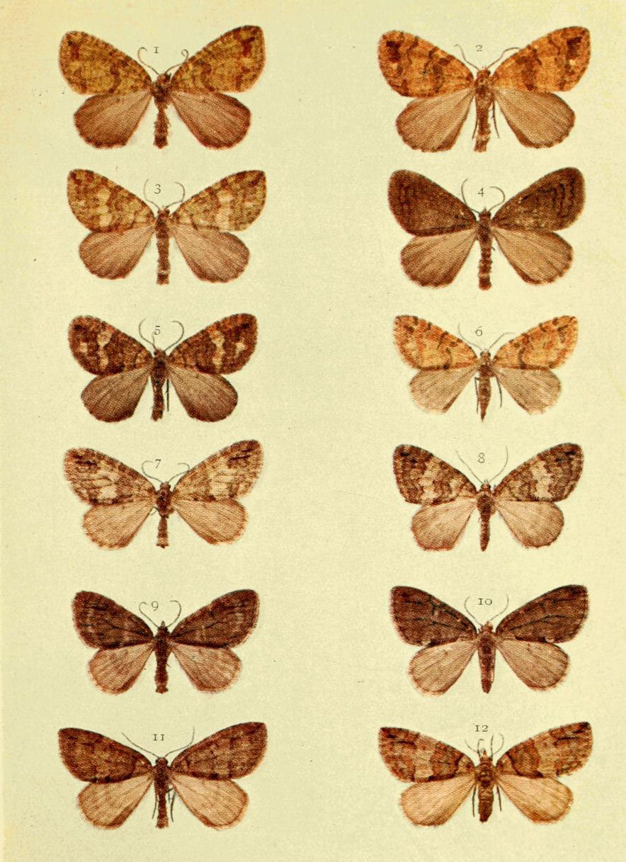 On Plate 9 is shown a male specimen of the typical form (Fig. 1). In ab. ochrea, Tutt, the general colour of the fore wings is ochreous with a greenish tinge, and so it differs from the type, in which the ground colour is reddish. In another ochreous form the cross bands are of a purplish tint (ab. punica, Borkhausen), and in ab. rufina, Hübner, the bands are also purplish, but the ground colour is of a somewhat brighter red than in the type. Ab. unicolor, Tutt, is dull reddish with indistinct cross markings, and seems to be a modification of the almost unicolorous form of a bright red colour, ab. rufa, Tutt. (Fig. 2.)