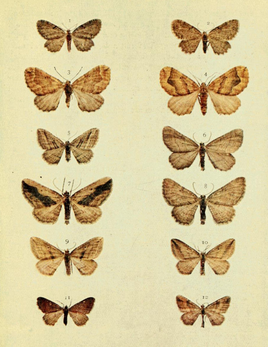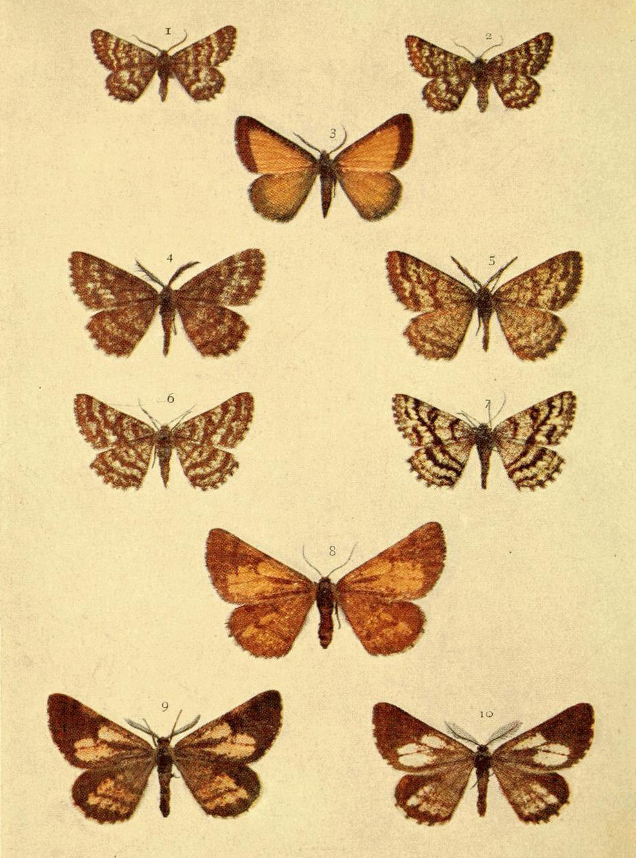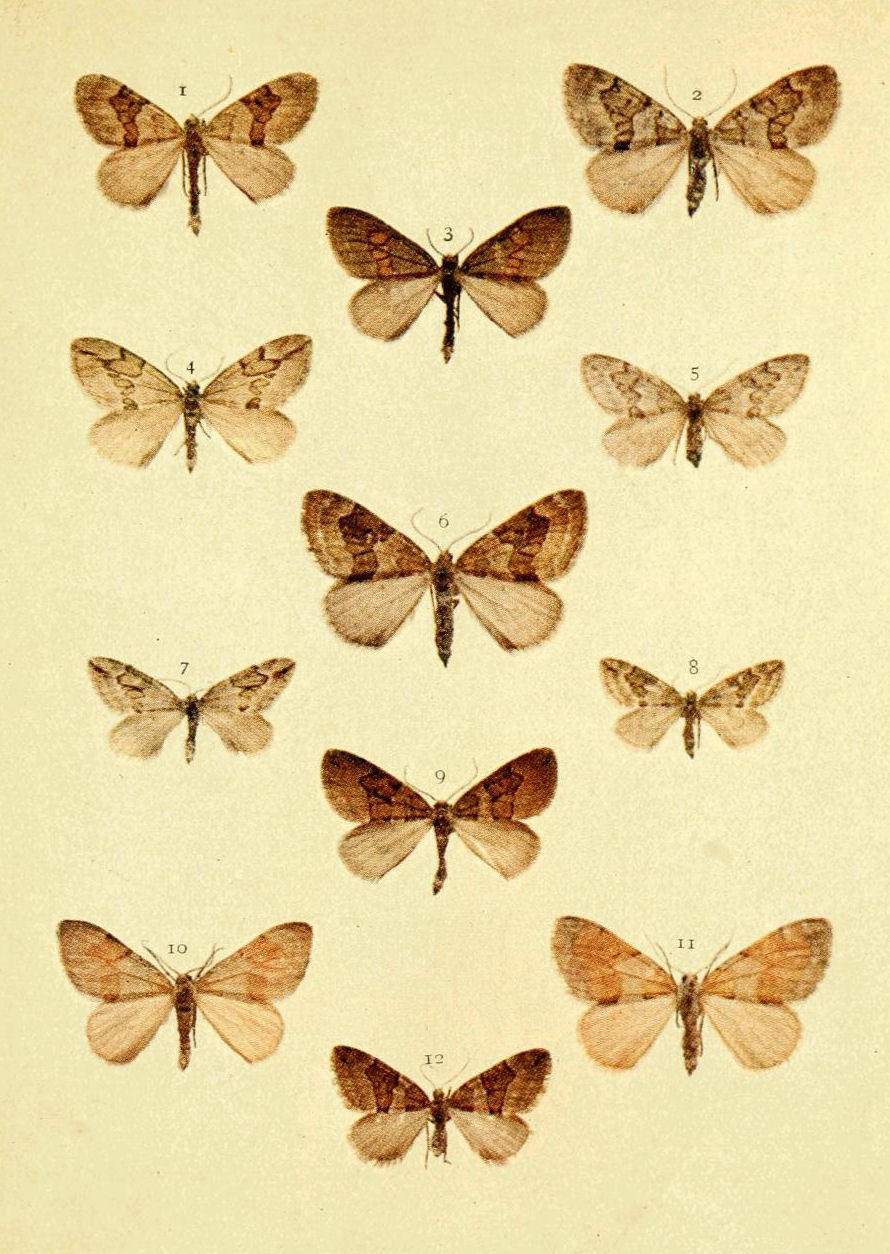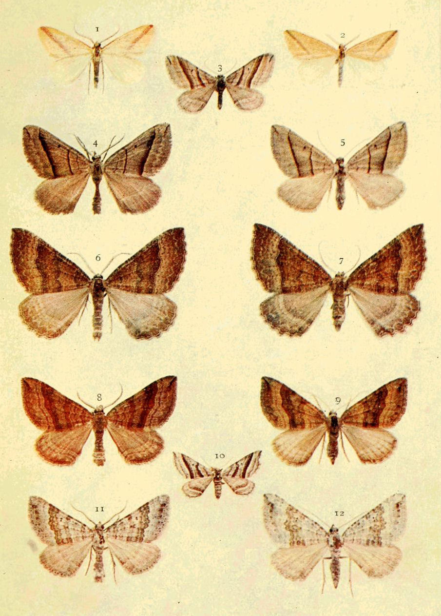 On Plate 9 is shown a male specimen of the typical form (Fig. 1). In ab. ochrea, Tutt, the general colour of the fore wings is ochreous with a greenish tinge, and so it differs from the type, in which the ground colour is reddish. In another ochreous form the cross bands are of a purplish tint (ab. punica, Borkhausen), and in ab. rufina, Hübner, the bands are also purplish, but the ground colour is of a somewhat brighter red than in the type. Ab. unicolor, Tutt, is dull reddish with indistinct cross markings, and seems to be a modification of the almost unicolorous form of a bright red colour, ab. rufa, Tutt. (Fig. 2.)