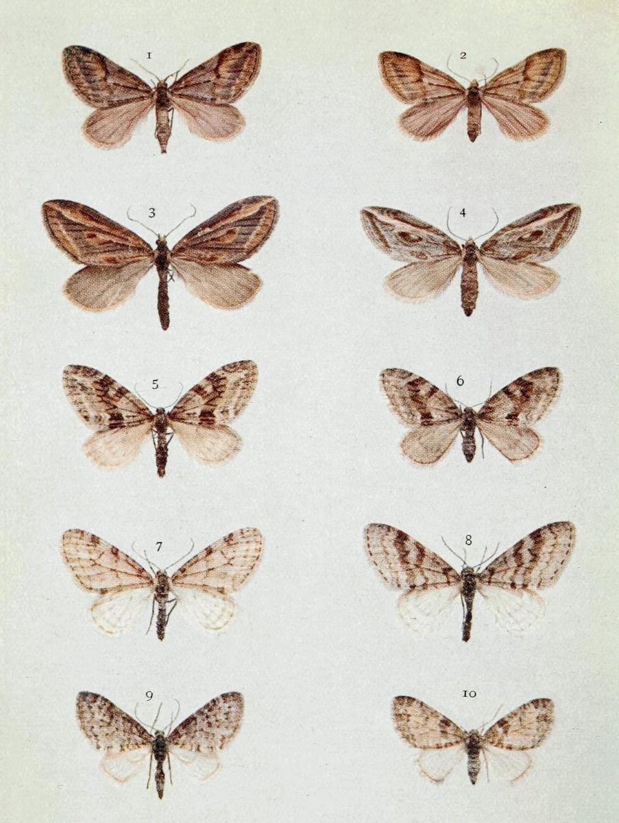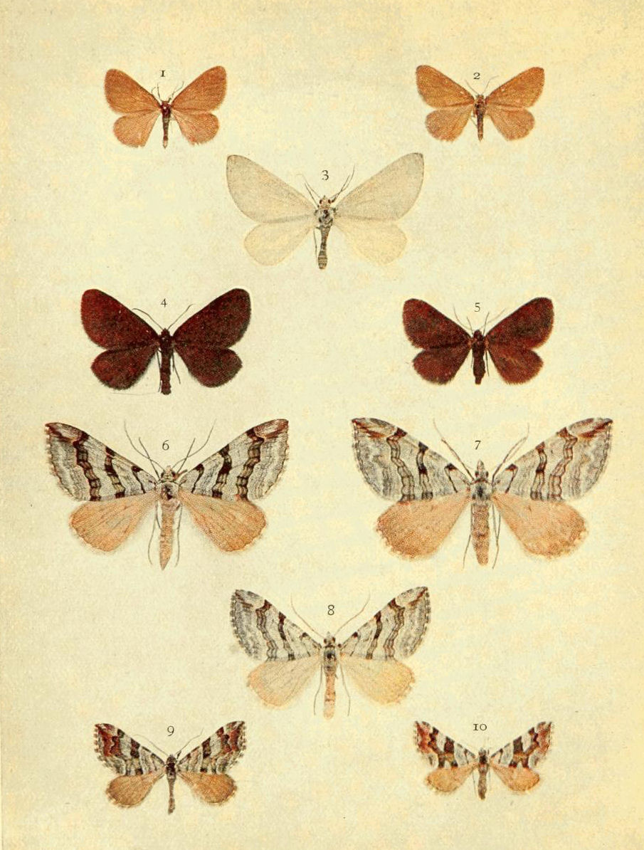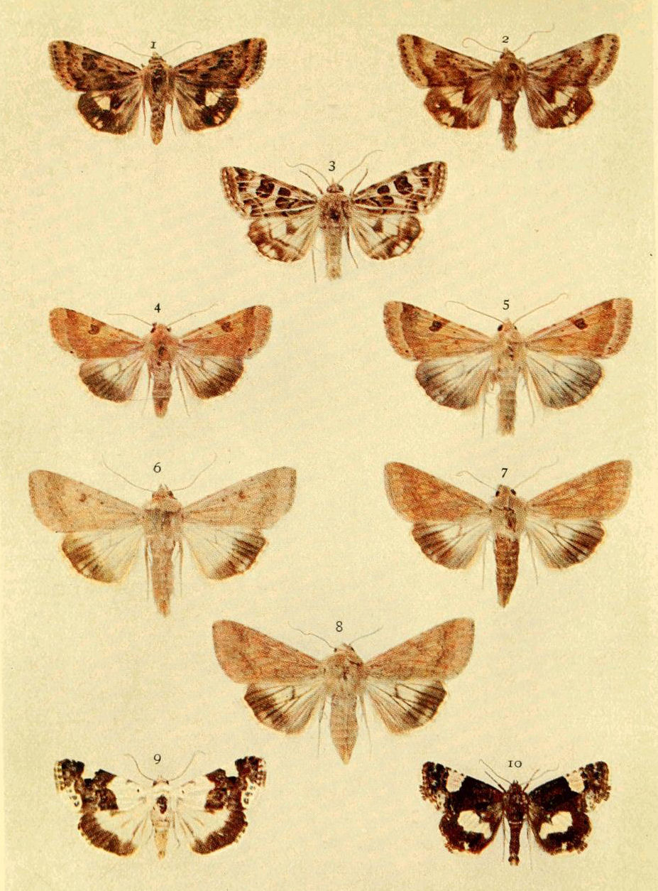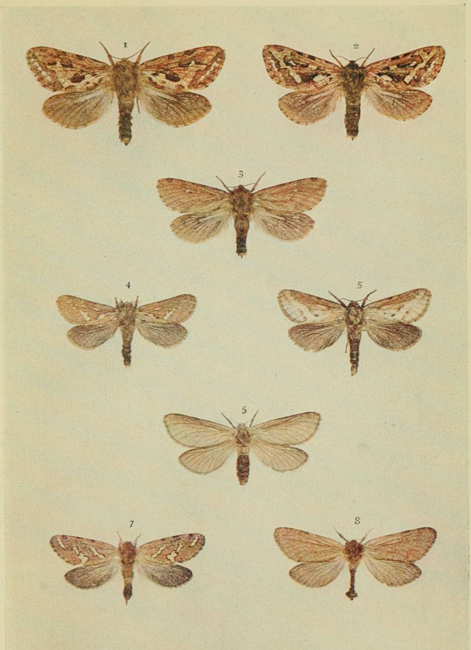 On Plate 9 is shown a male specimen of the typical form (Fig. 1). In ab. ochrea, Tutt, the general colour of the fore wings is ochreous with a greenish tinge, and so it differs from the type, in which the ground colour is reddish. In another ochreous form the cross bands are of a purplish tint (ab. punica, Borkhausen), and in ab. rufina, Hübner, the bands are also purplish, but the ground colour is of a somewhat brighter red than in the type. Ab. unicolor, Tutt, is dull reddish with indistinct cross markings, and seems to be a modification of the almost unicolorous form of a bright red colour, ab. rufa, Tutt. (Fig. 2.)