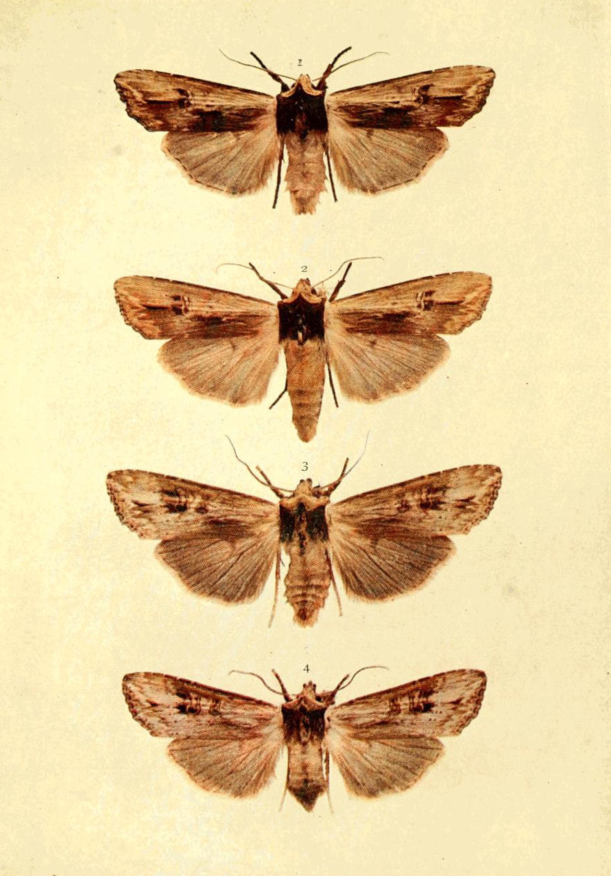 In the general colour of the fore wings, this species, of which four figures will be found on Plate 7, ranges from pale ochreous {12}brown to dark blackish grey. The typical form (lunosa, Haworth) has the ground colour pale, or bright, reddish (Figs. 1 and 3); the markings are well defined, and the wing rays are sometimes pale ochreous, or whitish. Four modifications of this form have been named; one of these has pale veins, but the general colour is red brown (ab. brunnea, Tutt); in another (Fig. 2) the colour is ochreous brown, the veins pale, and the other markings distinct (ab. humilis, Humph. and Westw.). Of the greyish forms, var. agrotoïdes, Guenée, is the darkest (Fig. 4).
