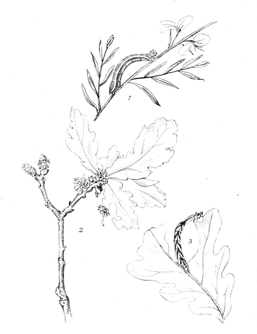 The full-grown caterpillar feeds, in April and May, on the foliage of the oak, the elm, and some other trees; also on sallow, hawthorn, and, according to Barrett, on bilberry and heather. In general colour it is brownish, often tinged with red, and more or less flecked with dark brown; a fine whitish line along the middle of the back is only clearly traceable on the front rings, but there is a very distinct white stripe along the region of the black spiracles. In an earlier stage it is green with three whitish lines on the back, and another on the sides.